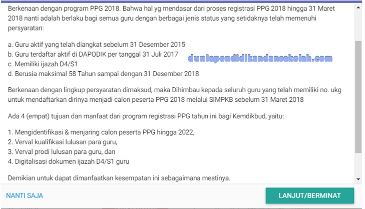 Semoga informasi tentang Pendaftaran PPG Dalam Jabatan (PPGJ) Tahun 2018-2022 bagi yang belum sertifikasi dan belum sertifikasi di SIM PKB ini bermanfaat untuk kawan-kawan semua dari kami kepolink.blogspot.com sampai jumpa kembali di artikel kami yang lainnya.